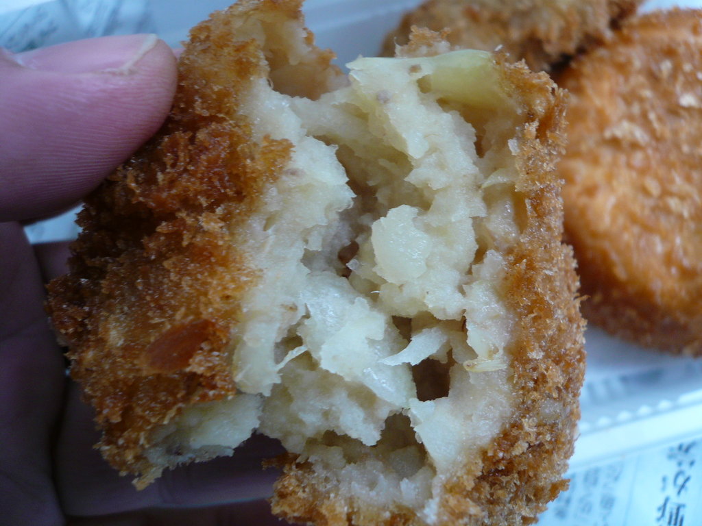 1個50円(税別)のコロッケは、完全手作り。けっこう塩味のきいたジャガイモコロッケだったな。みじん切りした玉ねぎとジャガイモそのものの甘みに、しっかりマッチしていたよ。1個1個の大きさが微妙にちがうのも、手作りらしくてよかったな。