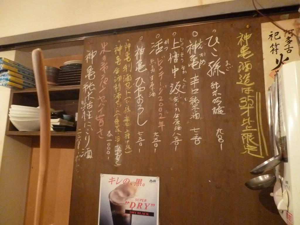 神亀ひやおろしを頼んでみたよ。残り香に甘味を感じる、独特な深みのある日本酒だったな。埼玉のお酒だってきいたけど、有名酒なのかな。