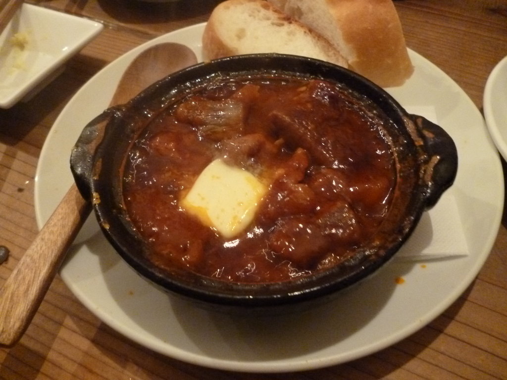 黒板メニューの牛すじのチリソース煮。といっても、チャイナな辛さではなくて、メキシカンの辛さ控えめなチリだったよ。よく煮込んであって、スープには旨味がとろけだしていて、これは絶品だったな。