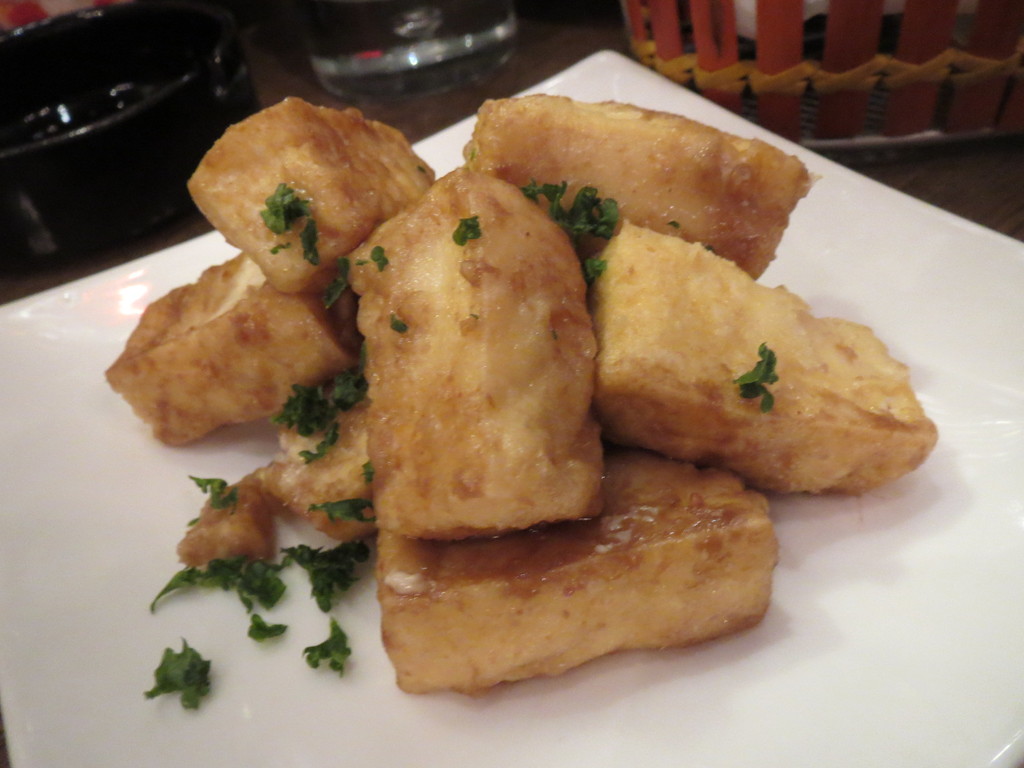 宴会前だから軽くつまめる物をと思ってメニューを見回してみたんだ。選んだのは「アンチョビ揚げ豆腐」。アンチョビを混ぜ込んだ衣で包んだとうふを揚げてあったよ。