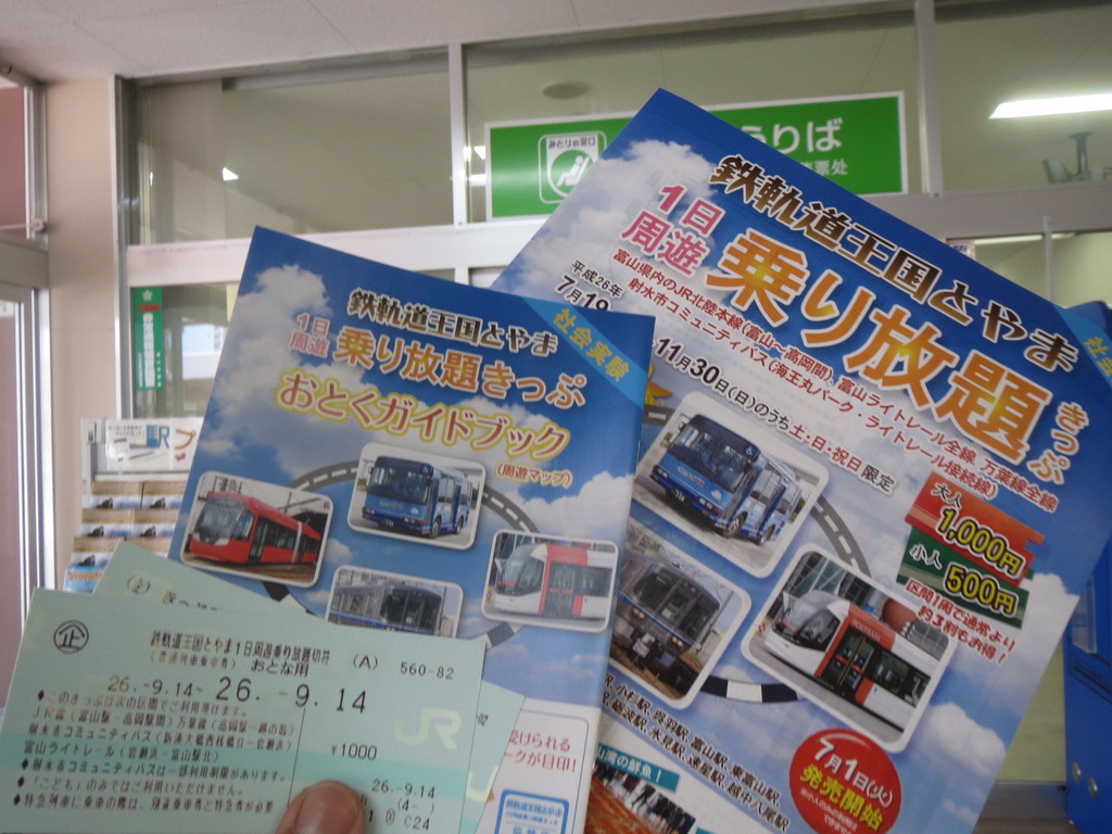 土日祝日のみ使える、県内1周鉄道クーポンが売られているのを見つけたよ。富山−高岡JR、万葉線、射水コミュニティバス(新湊−岩瀬浜)、ライトレールを1000円で回れるんだって。しかも、万葉線とライトレールは乗り放題。