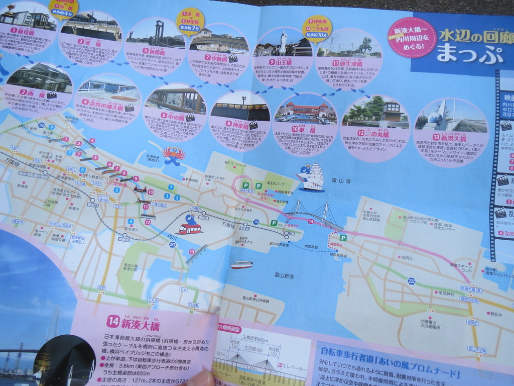新湊の内川へ行ってみたよ。たくさん架かっている橋を順に巡ってみたんだ。万葉線の中で見つけた、内川橋巡りマップ。