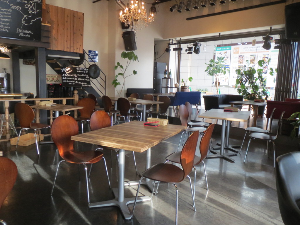 お店の中はこんな感じ。結構広くてテーブルもたくさんあるんだ。この日は、総曲輪通り側の壁を解放してあったよ。