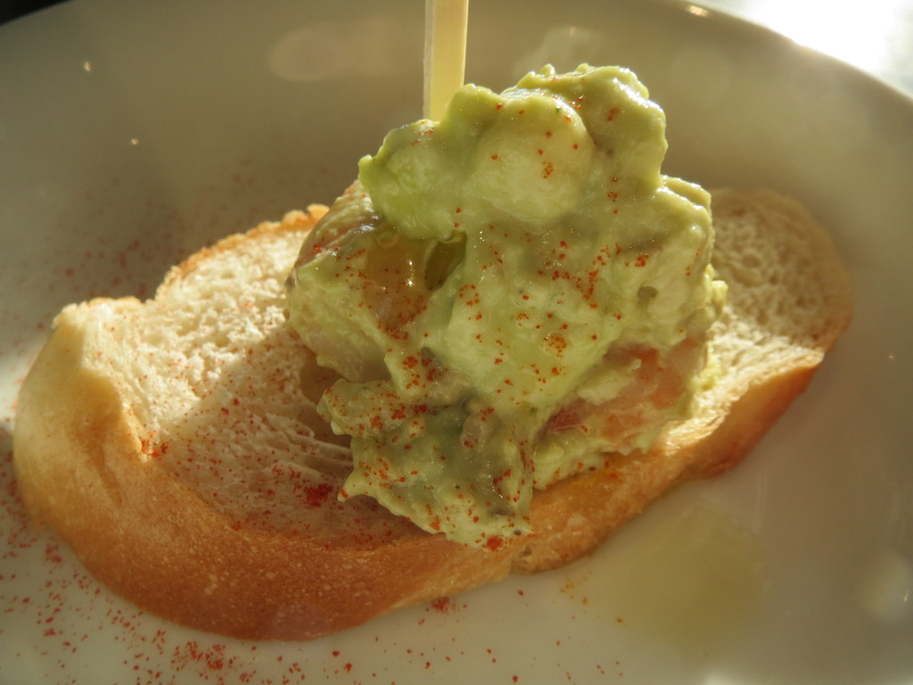 つきだしに、エビのアボカドソース添えがバケットに載って登場したな。味付けは控えめで、素材を大切にしている感じがしたよ。