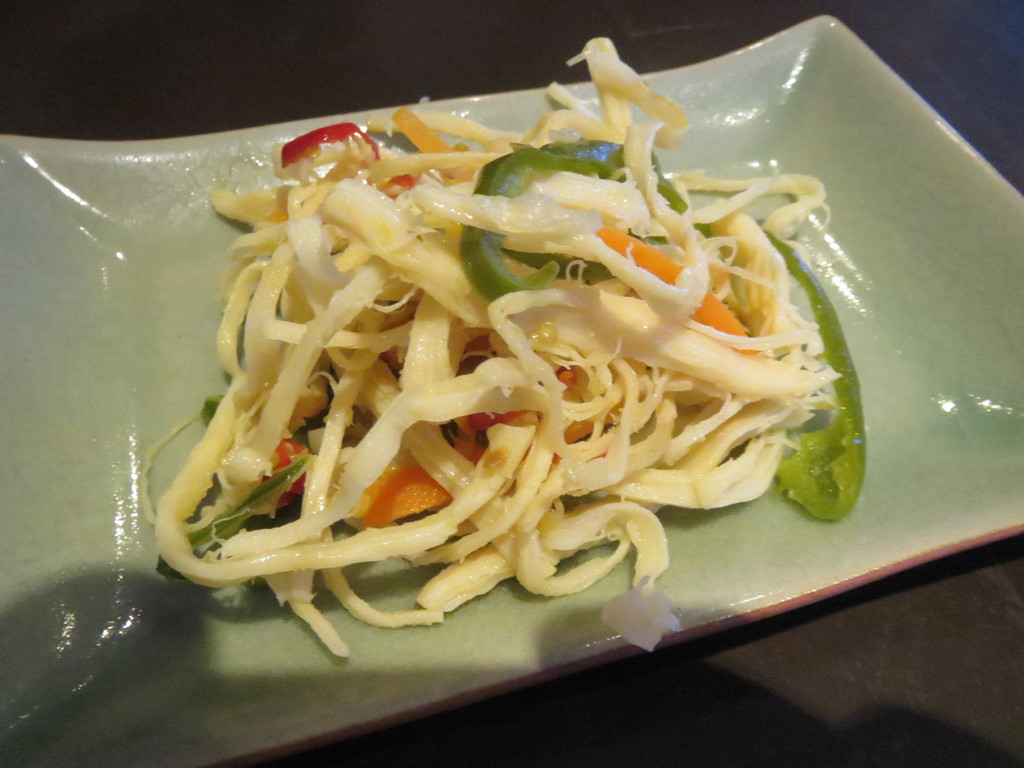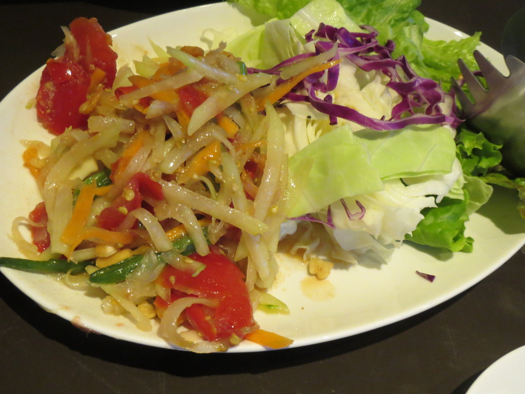 青パパイヤのサラダ 発酵魚入り。パパイヤが熟する前にサラダにしちゃうのは、沖縄料理と同じ発想だね。あっさりこりこりした食感が南国らしくていい感じ。