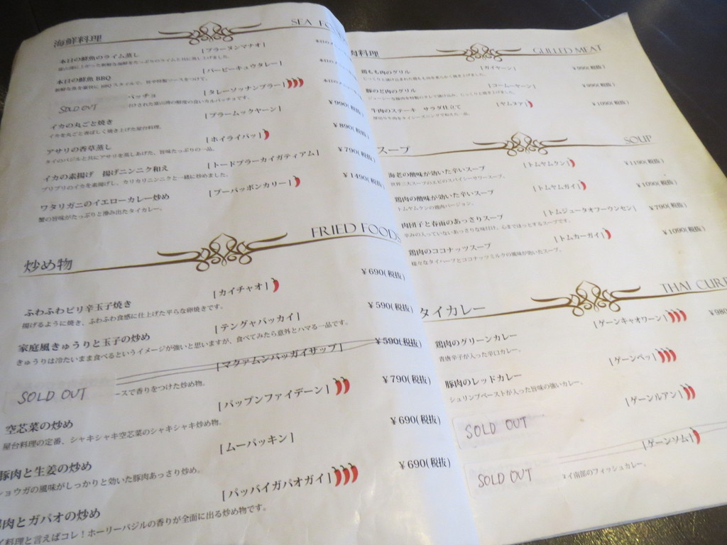 タイ料理といえば、西町にあった「ラーサ」でずいぶん前に味わって以来なんだ。メニューを見ると、「ラーサ」とはずいぶん違った印象。タイ南部の海鮮料理が目玉みたいだね。