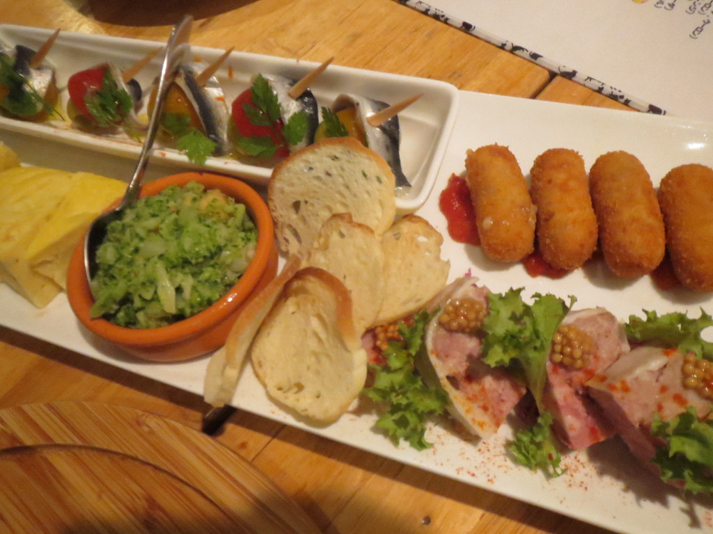 スペインでは、オードブルのような簡単な小料理をタパスと呼んでいるんだよね。これは、そのタパスの盛り合わせ。ジャガイモの入ったオムレツとか鰯の酢漬けとかクリームコロッケとか、日本人にもなじみのある食材が、すっかりスペイン風に生まれ変わっているんだ。