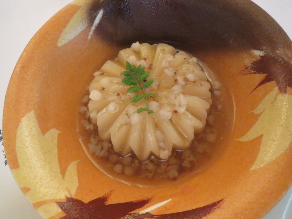 蕪を菊の花びらのように細工して、じっくりだしをしみ込ませた煮物。蕎麦の実が散らしてあって、香ばしい薫りに仕上がっているんだ。