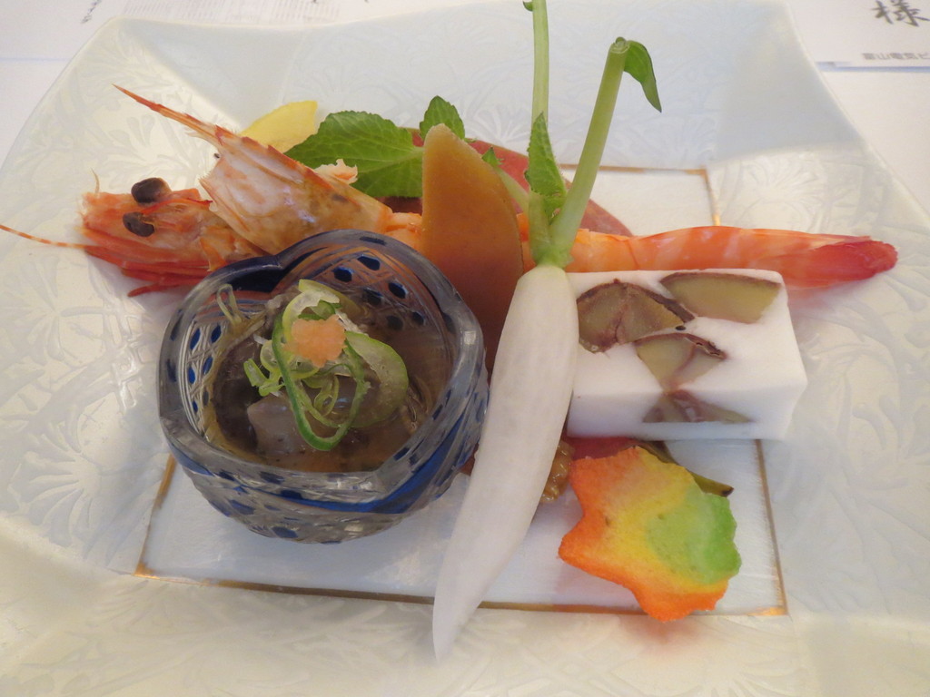 ちょっと気の張る席だったから、出てくる料理も素敵なモノばかり。酒の肴を盛り合わせた前八寸には、えび、なまこ、からすみ、クルミのミルク寄せといった品々が入っていたよ。ちょっとずつ入ったどれもが絶品の一皿だったな。