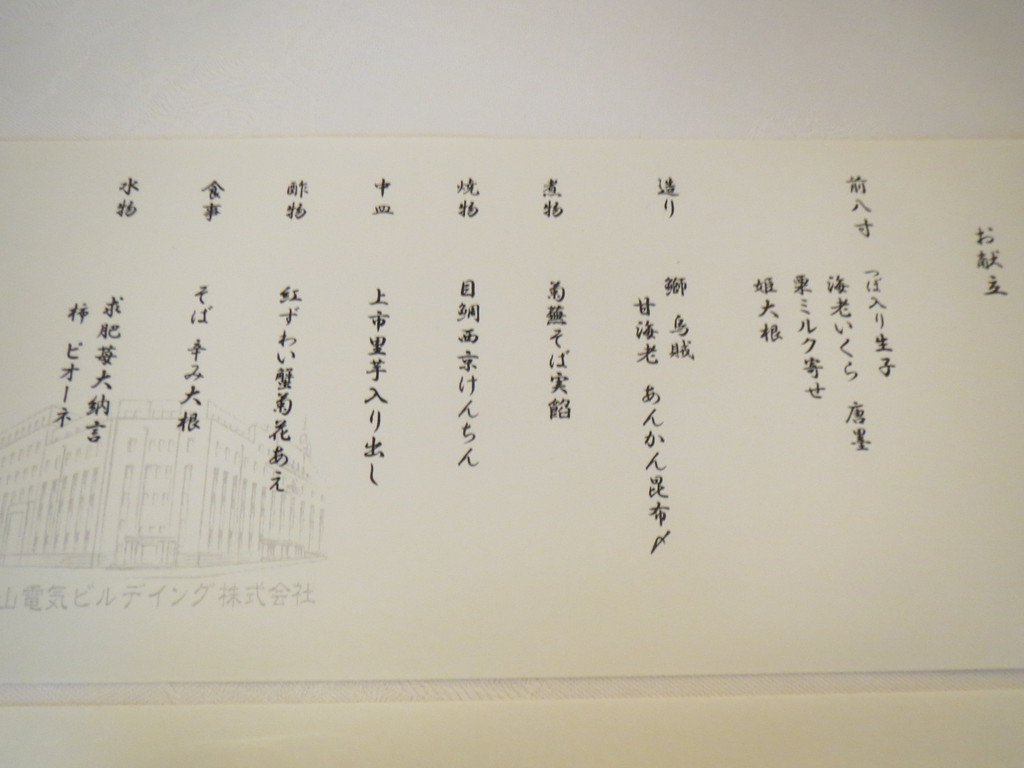 この日の献立は、こんなラインナップ。どれも、品のよい味付けで、ほどよい量で登場するのがさすがに「電気ビル」だと思ったな。