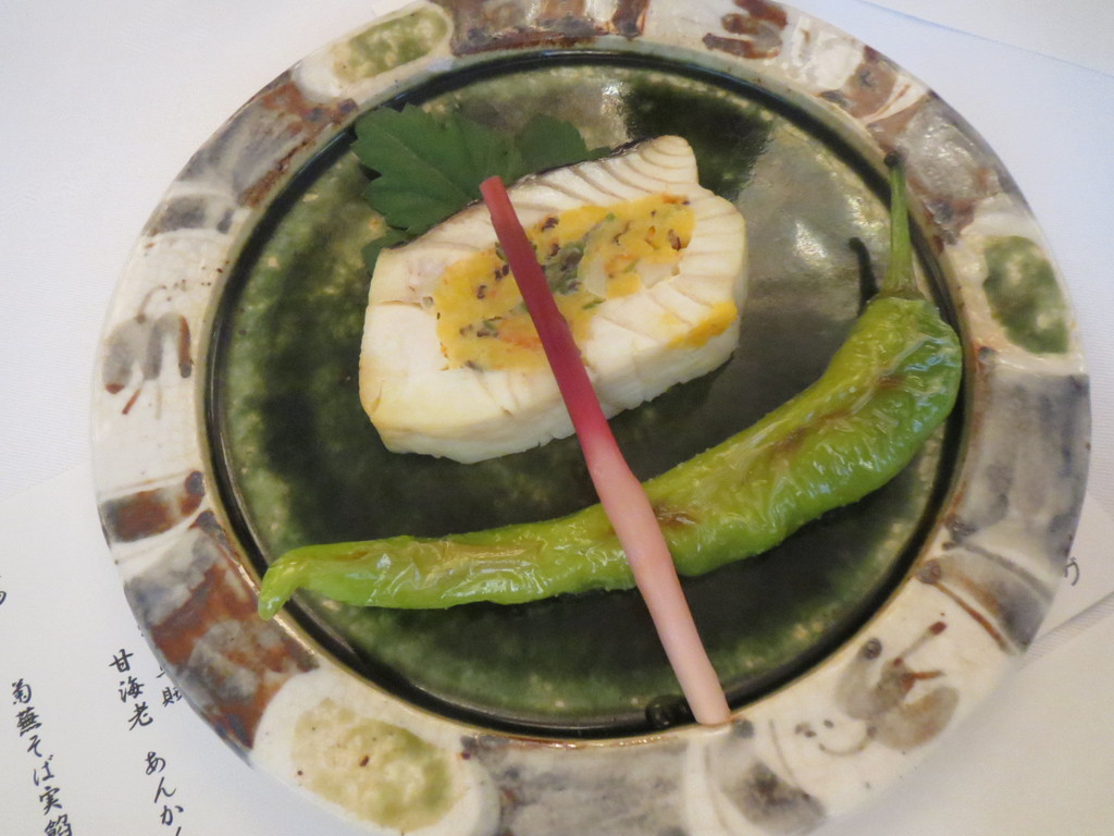目鯛という白身の魚の焼き物。中に入っているのは、西京味噌?コクのある味わいが、淡泊な白身に花を添えてくれるんだ。