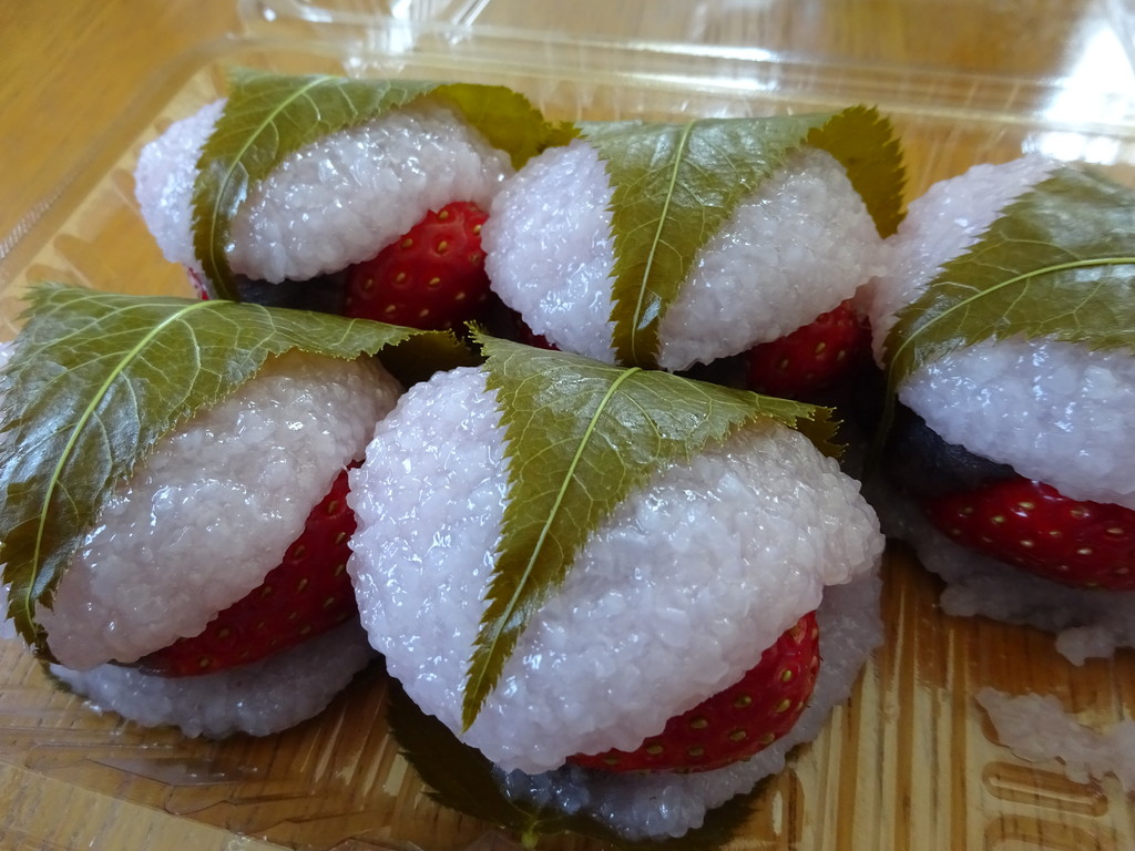 でもボクらの目当ては、『おもかげ』ではなく、この『春の苺桜餅』。桜餅の中にいちごを2個入れた、季節メニューなんだ。