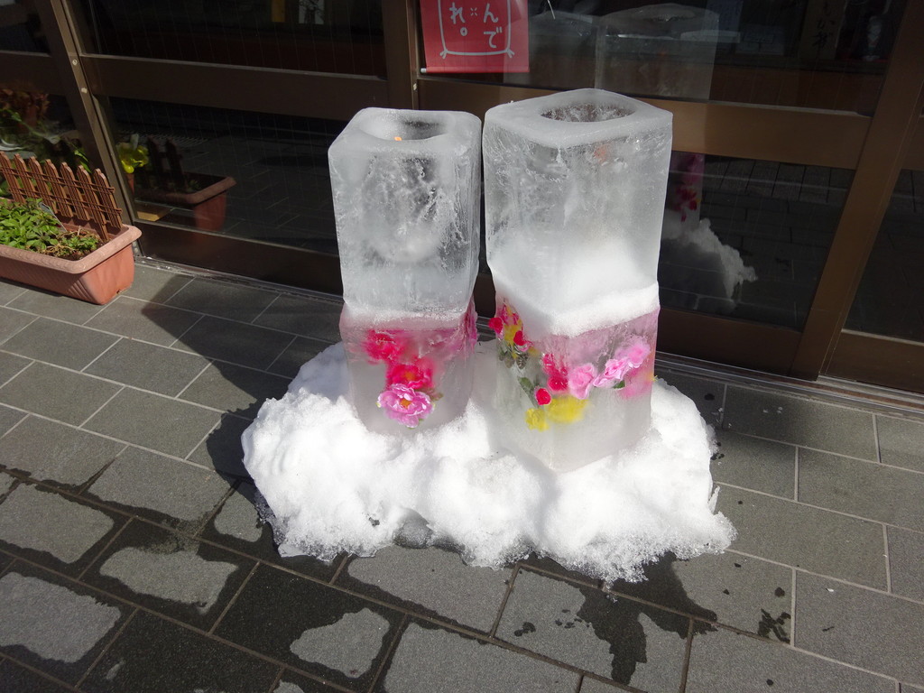 お店の前には、こんな氷の灯籠が置いてあったよ。とっても素敵だよね。中には、ろうそくがともっていて、その熱で氷がどんどん溶けていくんだ。