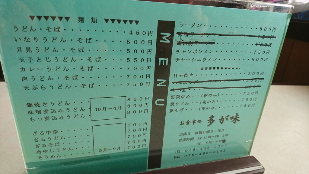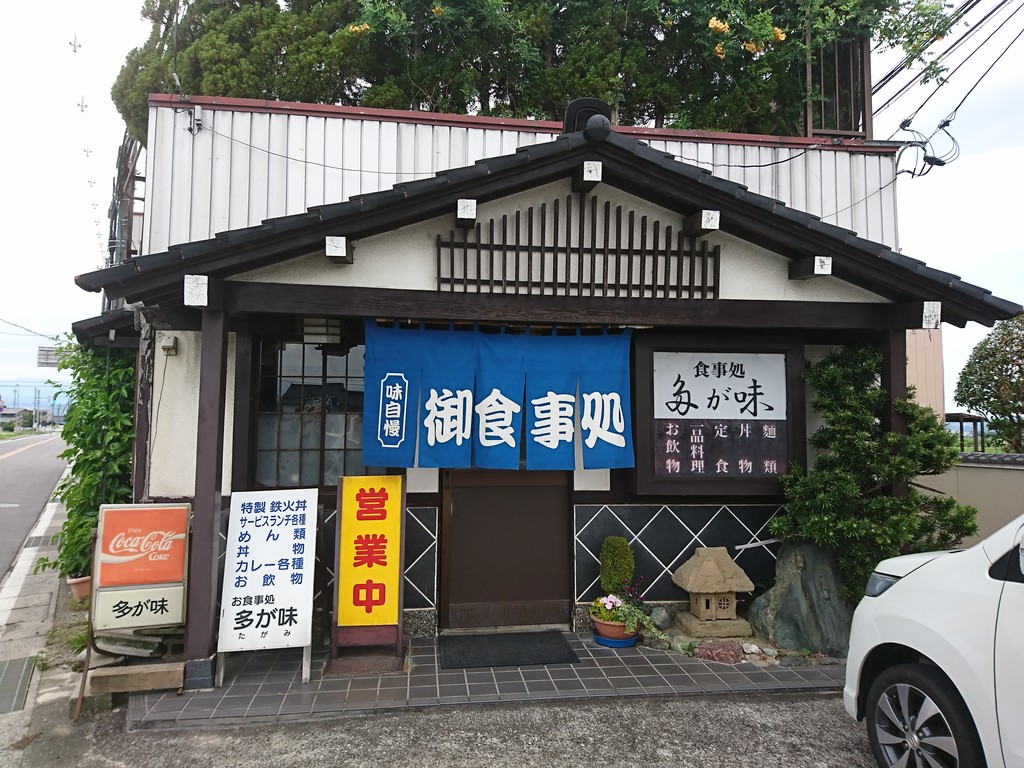 お店の名前は、「多が味」。セブンイレブンがある宮野小学校の近くの交差点から、堤防へ向かう道に曲がってしばらく行くと、この店に出会うことができるんだ。