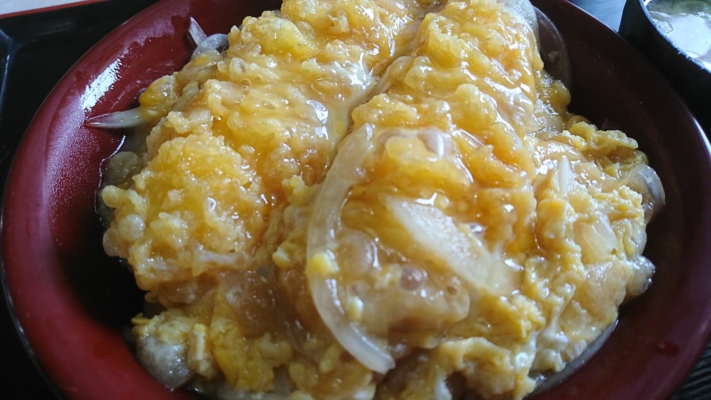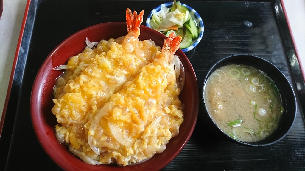 この日は、『カツ丼』と迷ったあげくに『玉とじ天丼』を注文。エビが2尾も入って味噌汁付きで登場してきたよ。