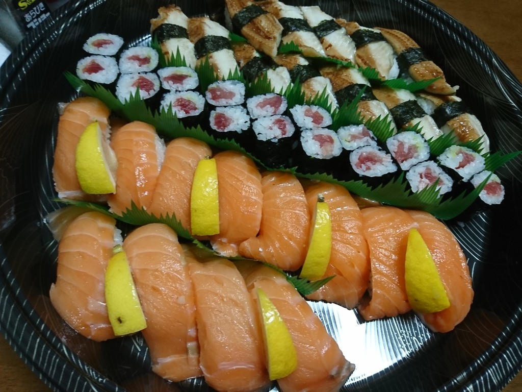 もう一つの桶には、家族のリクエストで、焼穴子と鮭と鉄火巻きの盛り盛り。これだけ並ぶと壮観だったけど、家族には『盛りすぎ〜』って笑われてしまったよ。