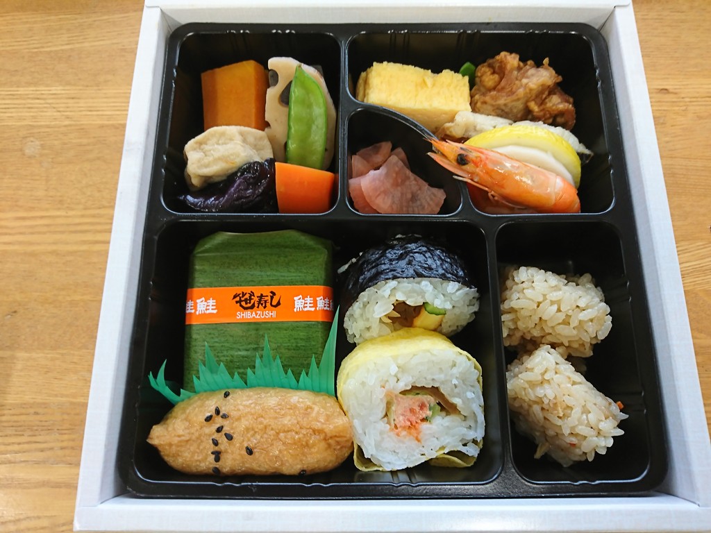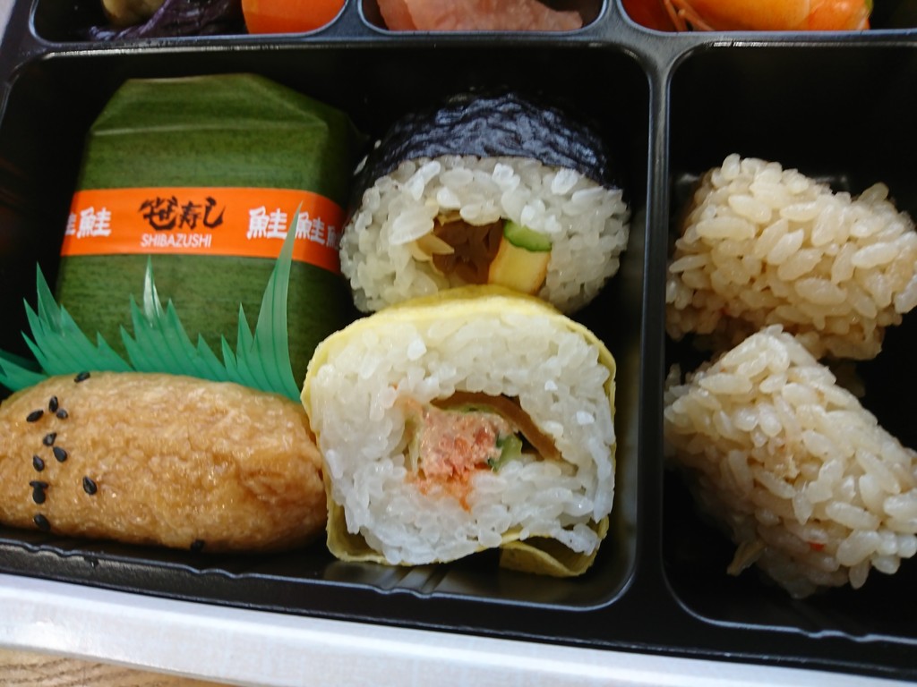 ふたを開けるとこんな感じだったんだ。笹寿しといなり寿司と海苔巻きとたまご巻きが1個ずつ。それに、炊き込みご飯の俵にぎりが2個入っていて、なかなかの炭水化物率だったな。