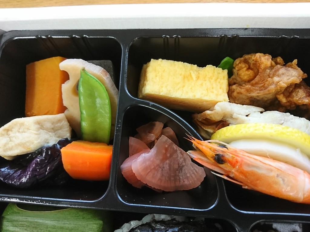 「芝寿し」には、おかずも付いているんだよね。まぁ、それはどの折でも中身はそんなには変わんないんだけど。この日の折には、鶏唐揚げ、玉子焼き、焼き魚に蒲鉾とエビ煮。もう一つのコーナーには