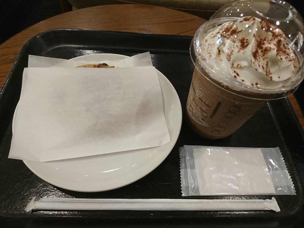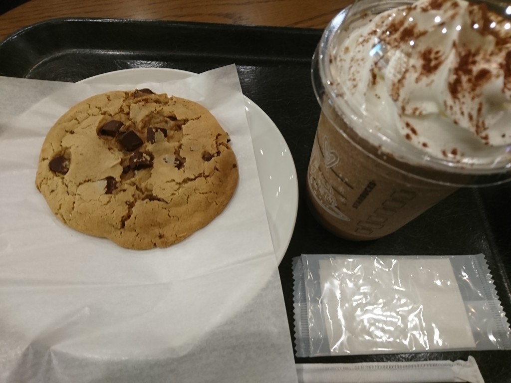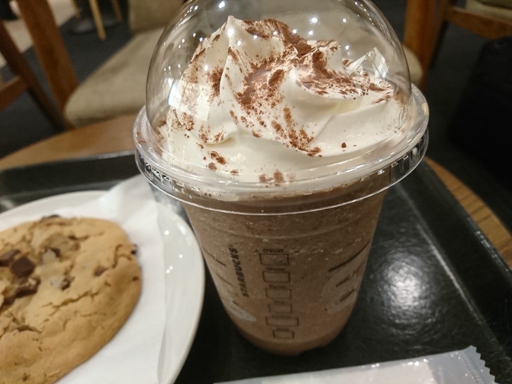 そんな時には、甘いものをいただくしかあるまい、ということで、モカフラペチーノを、チョコクッキーを添えて頼んでみたよ。