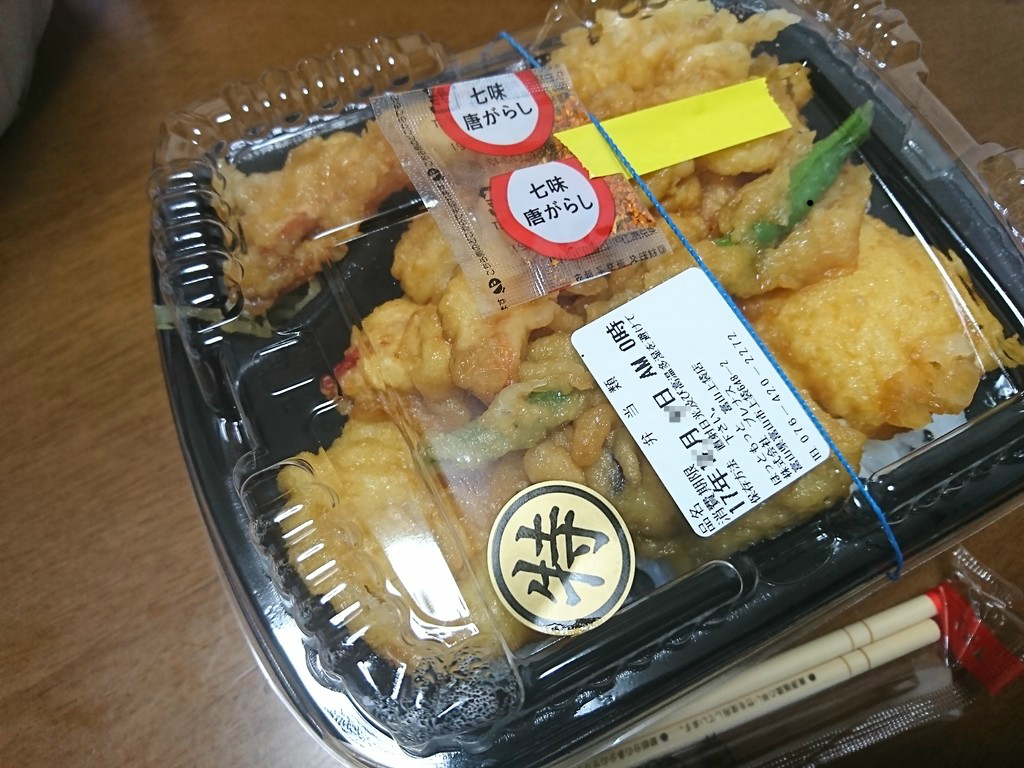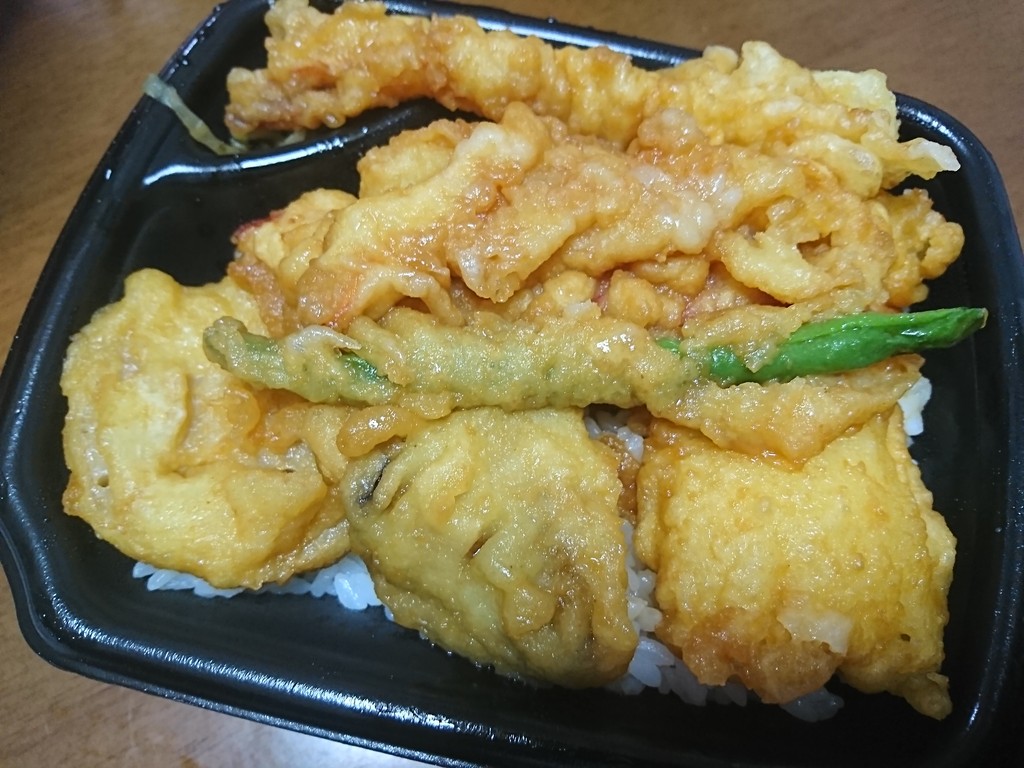 ふたを開ければ、ご飯をおおいつくす天麩羅のみなさん。海老が3尾に、ナス、蓮根と、さらにイカまで入った、ボリュームたっぷりな一品だったよ。濃厚なたれが、天麩羅とご飯にもしみていて、そして、これがまた絶品な味付けだったんだよね。あぁ、なんとも幸せな逸品だと思ったな。