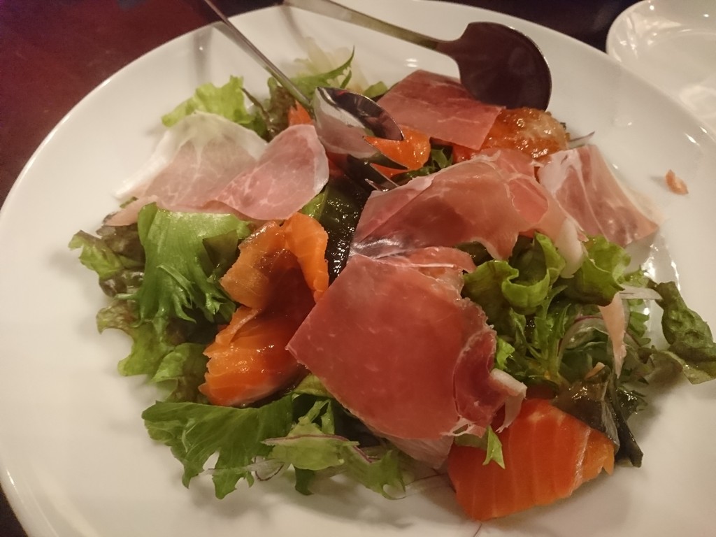 生ハムとスモークサーモンのサラダ。