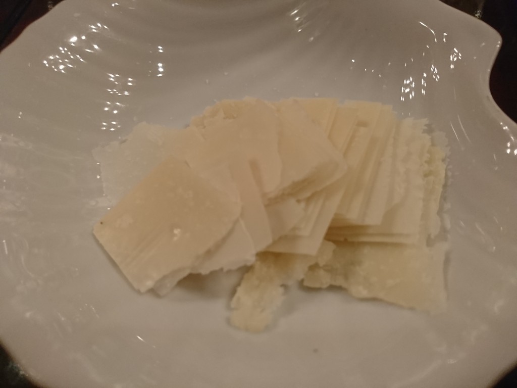 この店では、お通しに、パルメジャーノレッジャーノのスライスが出るんだけど、ボク的には、これがけっこういけると思うのだった。これを粉にしたのがパルメザンチーズなんだけど、粉にしないで、板状のままパスタに載せてもいいのではないかと思ったり。