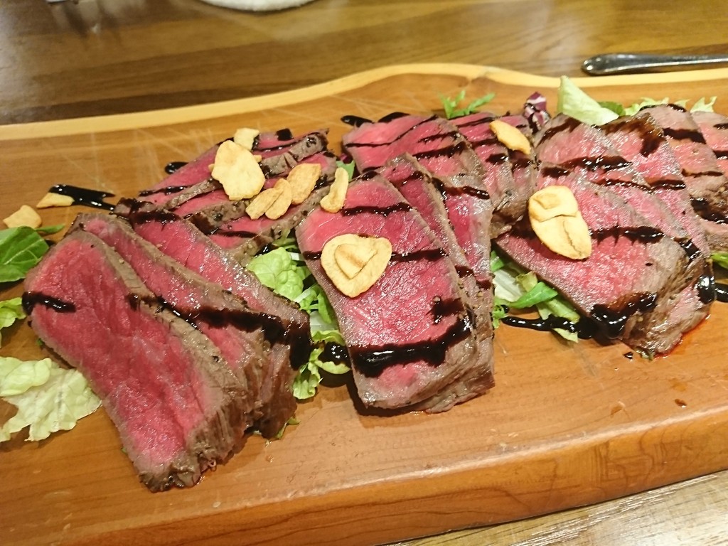 そして、肉の登場。赤身だけれど、とてもやわらかい熟成肉。バルサミコのソースをかけて、サラダ風にいただいたよ。