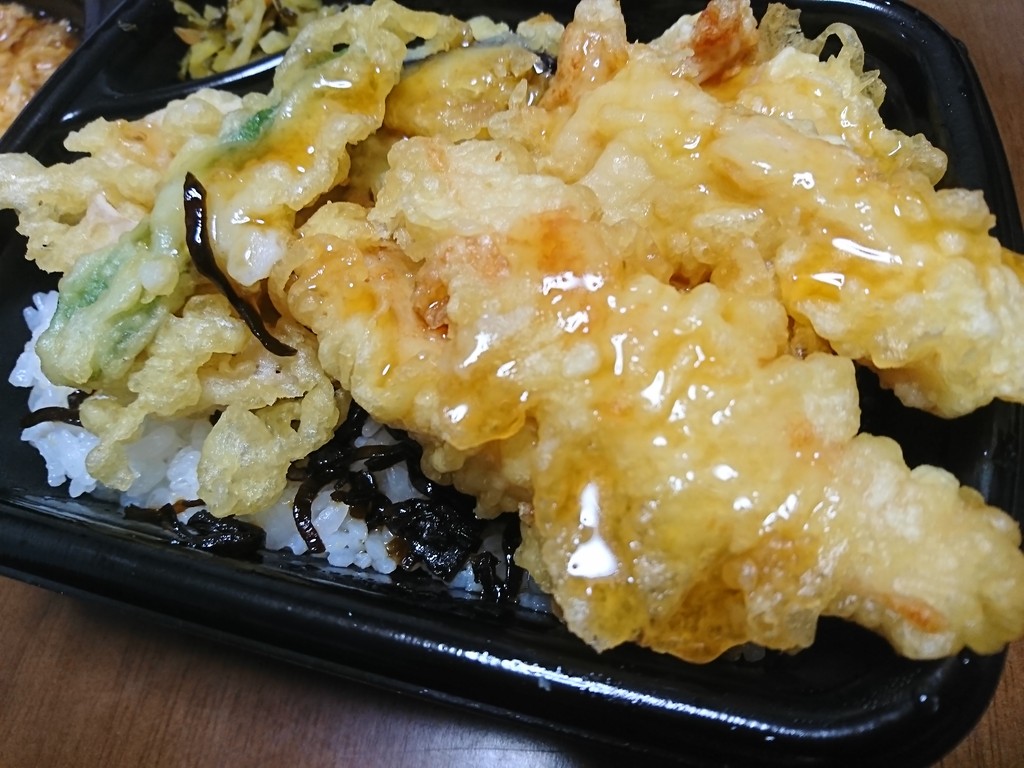 とり天丼には、少し餡かけ風になったたれをかけていただくんだ。とり天の盛りは、なかなかけっこうな量だったし、ナスとか、インゲン豆とか、カニかまとかの天ぷらもついていて、かなりのボリューム。味よし、量よしで、満足のいく弁当だったな。
