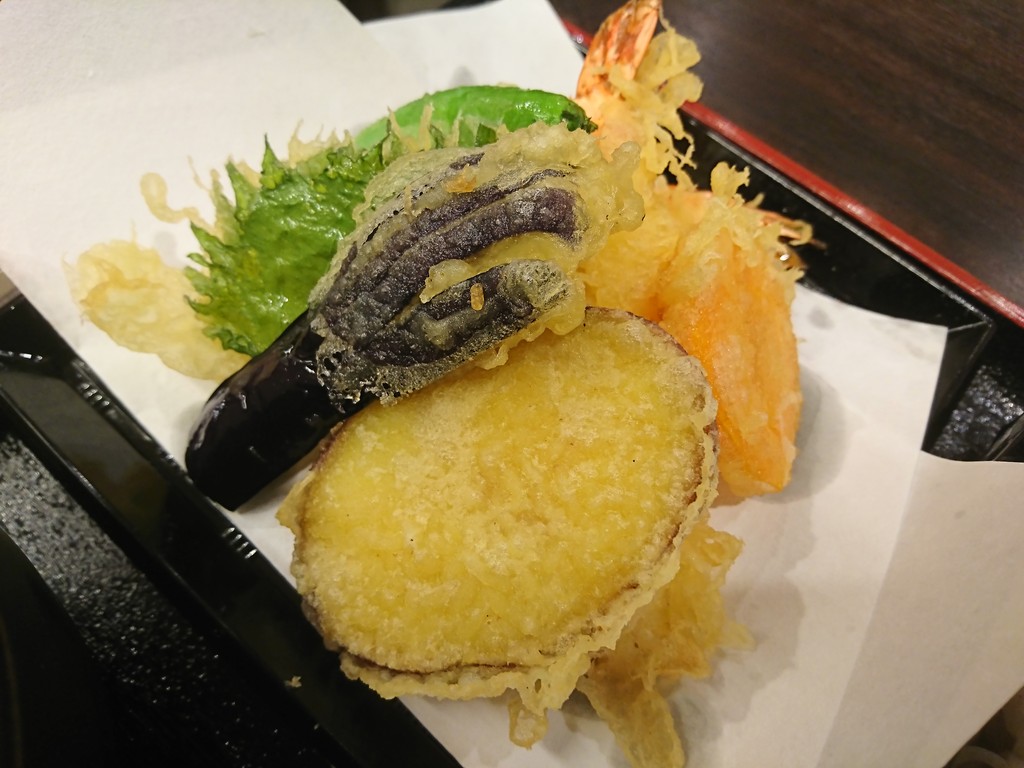 天ぷらには、エビが2尾と、ナス、ニンジン、さつまいも、ししとう、大葉といった野菜の盛り合わせ。サクッと揚がっているのが見事だったよ。