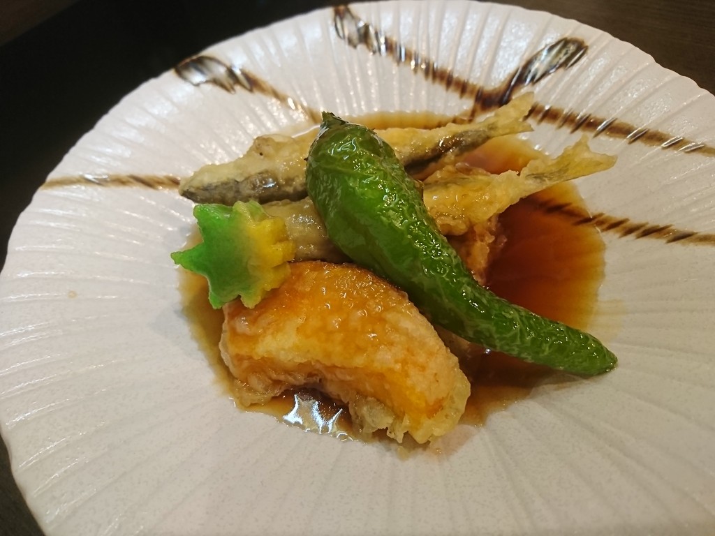 揚げ物には、鮎の天ぷらの煮びたし。小ぶりだけど、苦みが旨味になる鮎らしさは、大人の味だね。