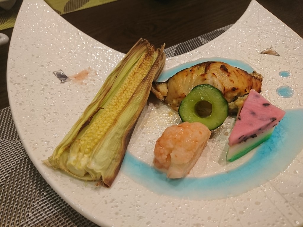 焼き物は、魚に、すり身やスイカをかたどったかまぼこが添えてあったんだ。そして、焼いたヤングコーンが1本載せてあったんだけど、これがねぇ、香ばしくてヤングコーンの味と香りも豊かで、とってもよかったんだよね。