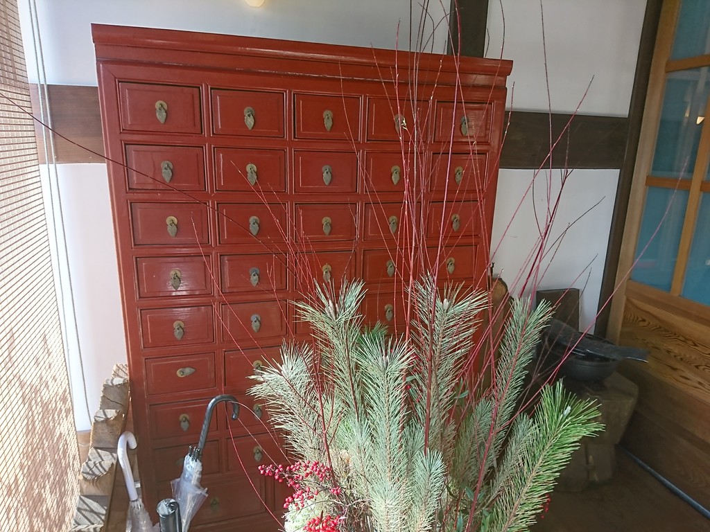 玄関にはこんな棚が飾られていたな。こういう小引き出しがたくさんついた棚って、ボク的には昔の薬屋さんのイメージ。
