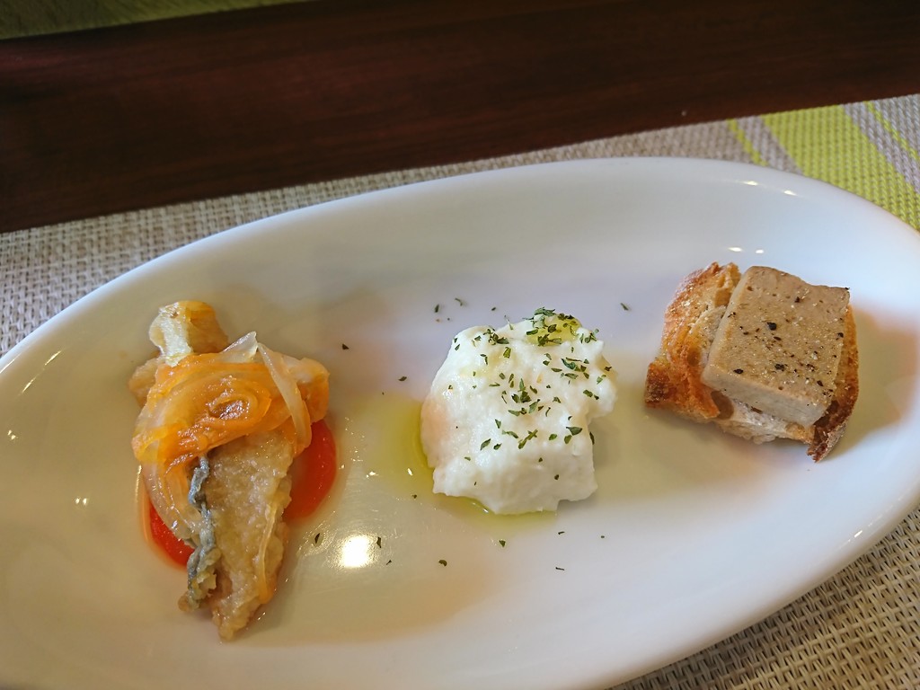 まずは、スープと3種のオードブルが登場。