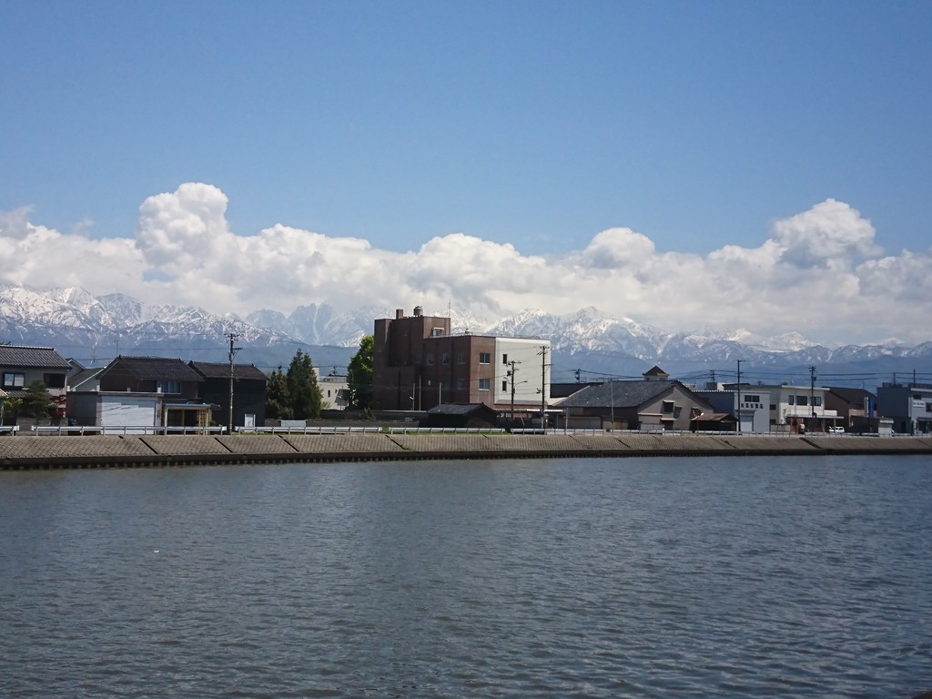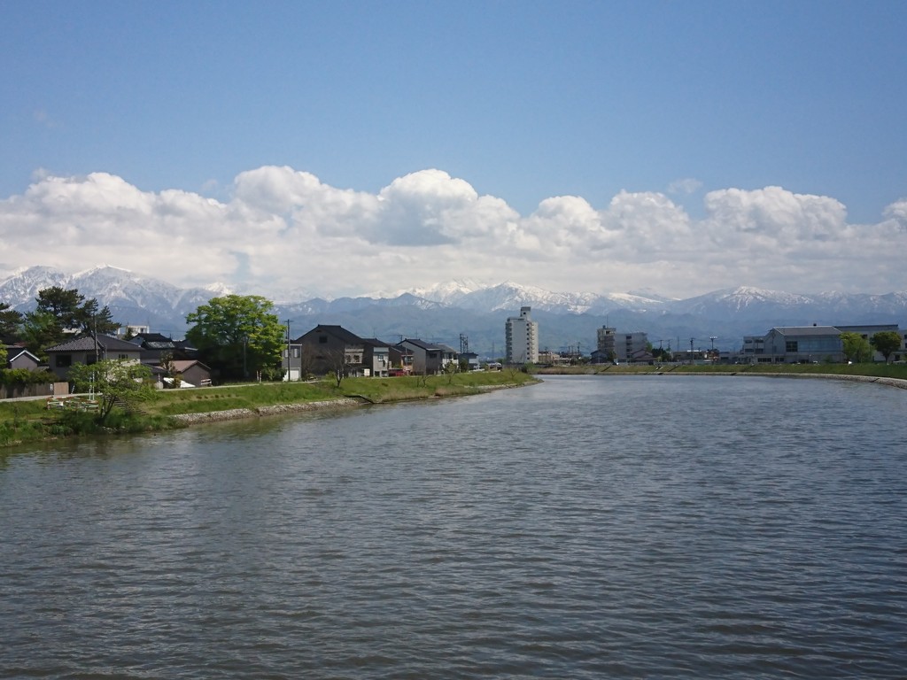 水橋までやってきたのは良いけれど、一体どこに何があるのか、予備知識はほとんどなし。とりあえず、白岩川を渡って東の方に歩いてみたよ。立山が雲に包まれて、いい感じの風景。