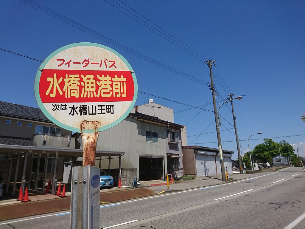 ライトレール岩瀬駅からフィーダーバスに乗って、水橋までやってきたよ。終着バス停は「水橋漁港前」。中心部からは、白岩川をはさんで西側にあるんだ。