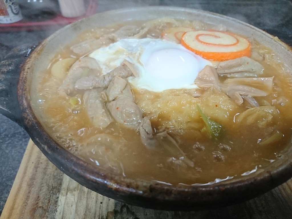 それにしても、見事な煮立ち具合だったな。これだけ熱々だと、真ん中の生卵も、なかなかの半熟具合になるんだ。たっぷり入ったもつは柔らかく、かなり太めなうどんはもつに絡んだ味噌の溶け出した濃厚な出汁にも負けない存在感がありと、何拍子もそろった絶品うどん。高い人気を誇るのも実に納得な逸品だよね。