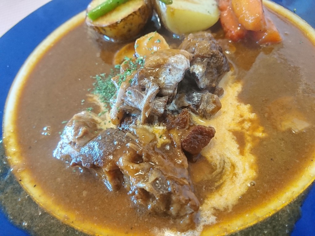 登場したのがこちら。柔らかく煮込まれたビーフが、デミグラスソースに包まれて、ゴロゴロしていたよ。ふんわりほどけていくビーフの感触が、なかなかみごとなのだった。
