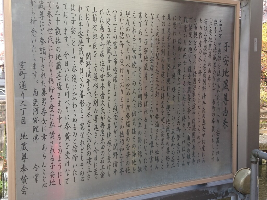 いたち川のほとりにある子安地蔵尊 2019年12月03日 この日は、とてもうららかな天気。風が吹くとそれなりに冷たいんだけど、空は青空で日の光が温かだったんだ。こんな日は、散歩に出かけるに限るよね。 かくして、大泉界隈から清水町方面に向かって、いたち川のほとりを歩いてみたよ。水神社の銀杏は、まだ青々とした葉をつけていたな。←富山を元気にするブログがいっぱいあるから、見てね〜。 室町通り界隈には「子安地蔵尊」というのがあるんだね。子どもの安産を願う地蔵尊。戦災で焼けたけど、戦後復活した現在の地蔵尊が、今でも大切にされているみたい。 今でも、無事に子どもが生まれた家族から寄進があるみたい。地元の人を今でも見守ってくれる、お地蔵様だよ。 < 前の記事次の記事 > コメント コメントフォーム 名前 コメント 評価する リセット リセット 顔 星 投稿する 情報を記憶