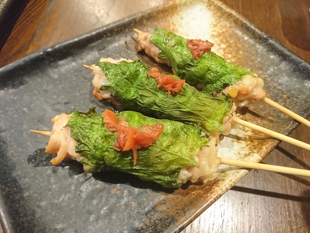 『せせりの大葉巻』には、梅肉が添えてあったよ。せせりとは、首の周りの希少な部分のこと。量は少ないけど、その濃厚な味わいに特徴のある部分なんだ。それが大葉の香りと相まって、より一層うまみを感じる一本だったよ。