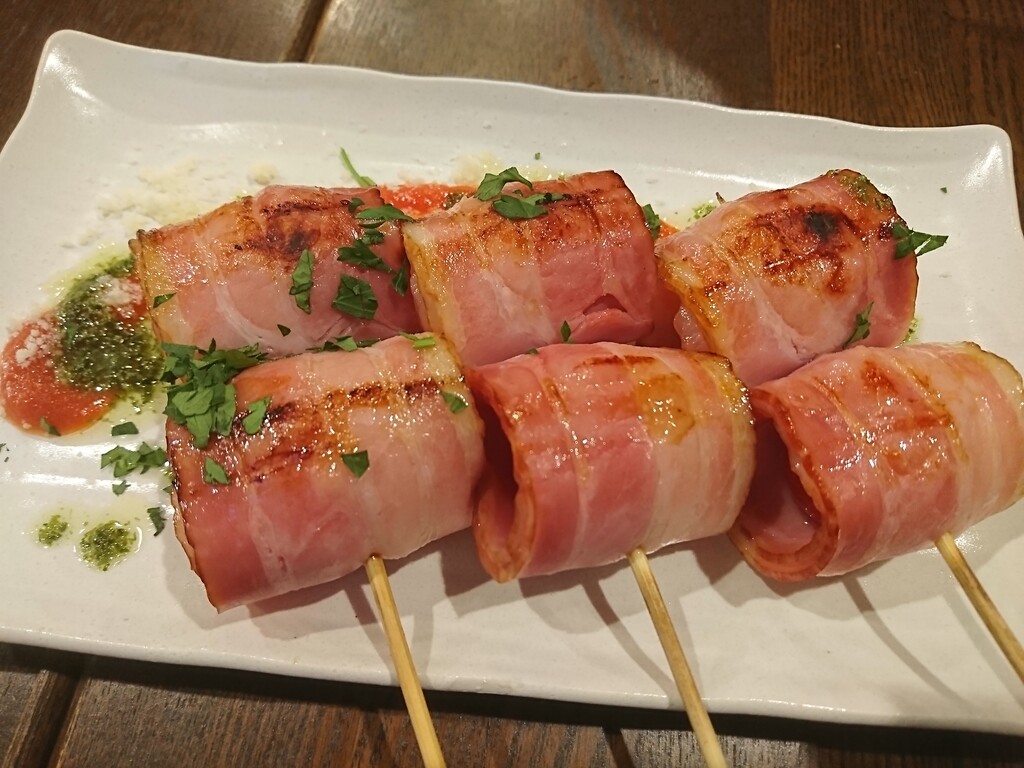 まずは、『プチトマトのベーコン巻』。このお店のお料理には、ちょっとずつイタリアンテイストが加えたものがあるんだね。この串には、バジルソースが添えてあったよ。口の中で一口噛むとバジルの香りとトマトの酸味がふわっと広がってなかなかの美味。