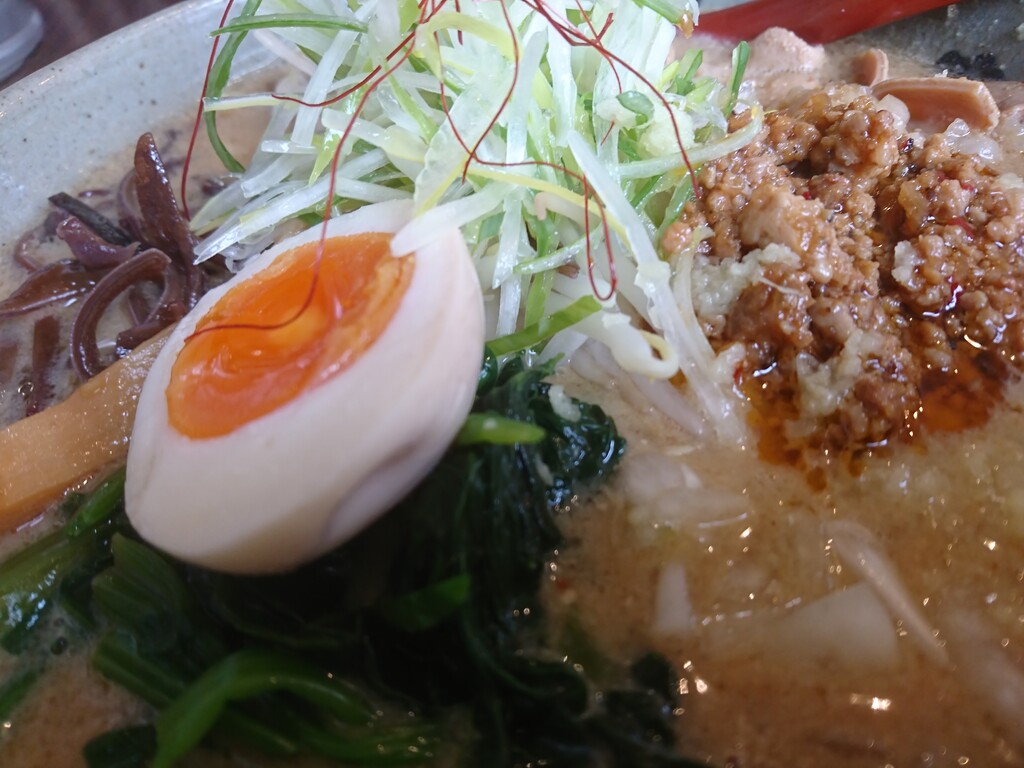 かくして登場したのがこちらだよ。何とも見事に具沢山。メンマ、牛もつはもちろんのこと、坦々風のひき肉、半熟ゆで卵、ほうれん草、キクラゲと実にいろいろ入ってたし、ネギも白髪ねぎになっていて、とても手がかかっているのが伝わってくるんだ。もやしも玉ねぎも入っている?いやはや、まったくもって素晴らしい。
