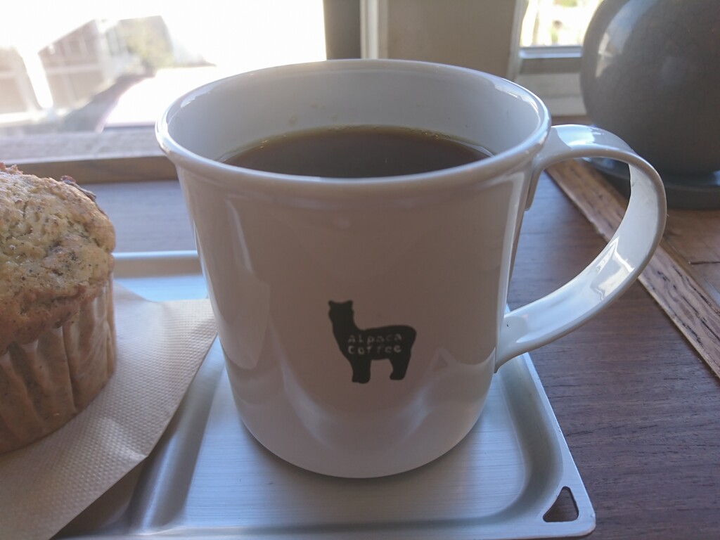 この日は、散歩の途中にコーヒーブレーク。立ち寄ったのは、太郎丸にある焙煎珈琲の店「アルパカコーヒー」だよ。この店では、2階に席が設けてあって、カフェになっているんだ。こんな空間でマフィンと一緒にコーヒーを味わうのも、素敵な時間の使い方だよね。