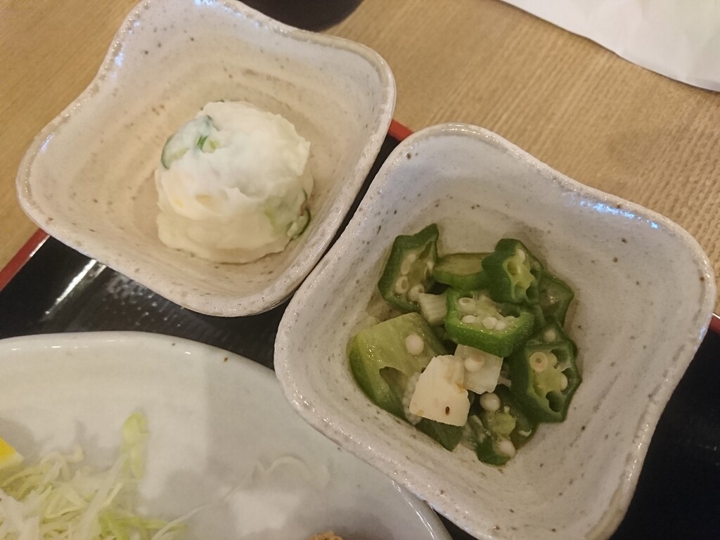 2つ付いた小鉢には、『ポテサラ』と『山芋オクラ』。これだけおかずがついていたら、ご飯も進むのだった。