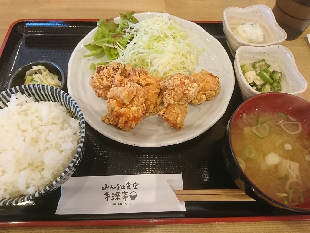 いろんな定食メニューがあったけど、この日のチョイスは『からあげ定食』。誰かの席に運ばれいていくのを見て、そのまま釣られるように注文してしまったんだ。かくして登場したのがこちら。