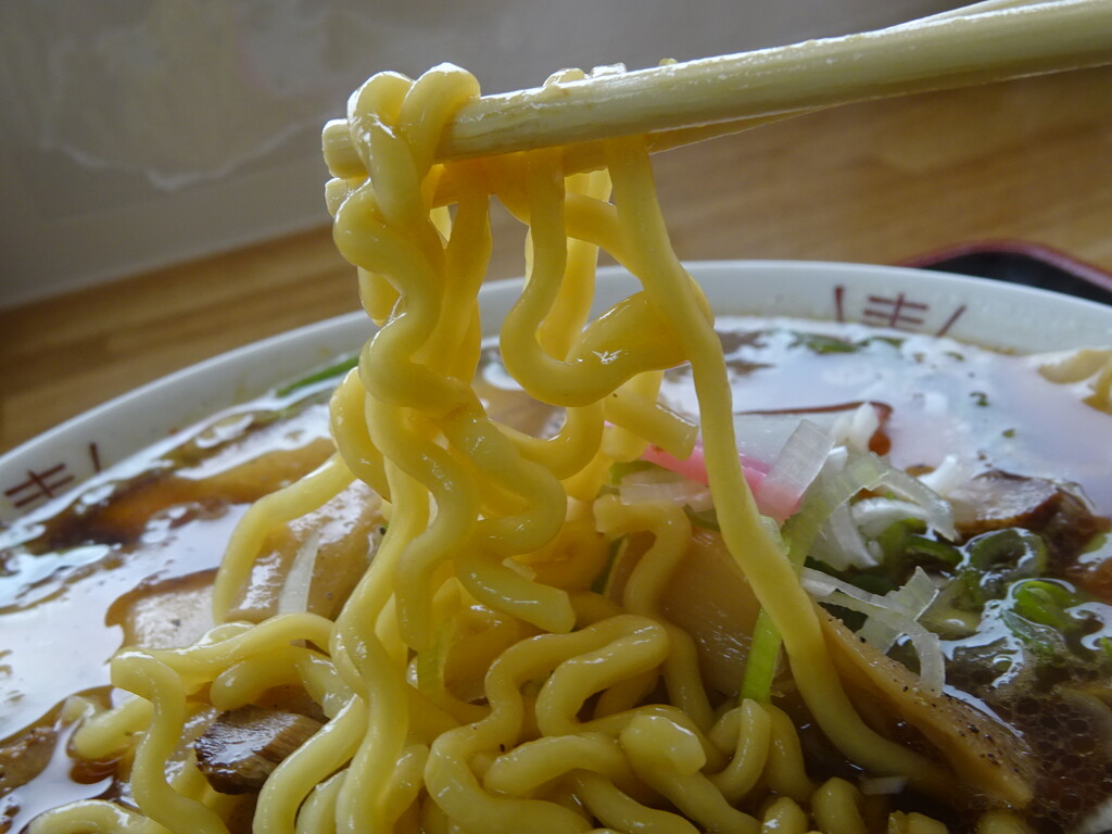 薄くスライスしたチャーシューとかなり塩っぱさの効いたスープは、「大喜」に通じる感じ。それも、どちらかと言うと「西町大喜」ではなく「根塚大喜」なんだ。真っ黒じゃなくて、ちょっとブラウン。かまぼこが一切れのっているのが、ご愛敬。