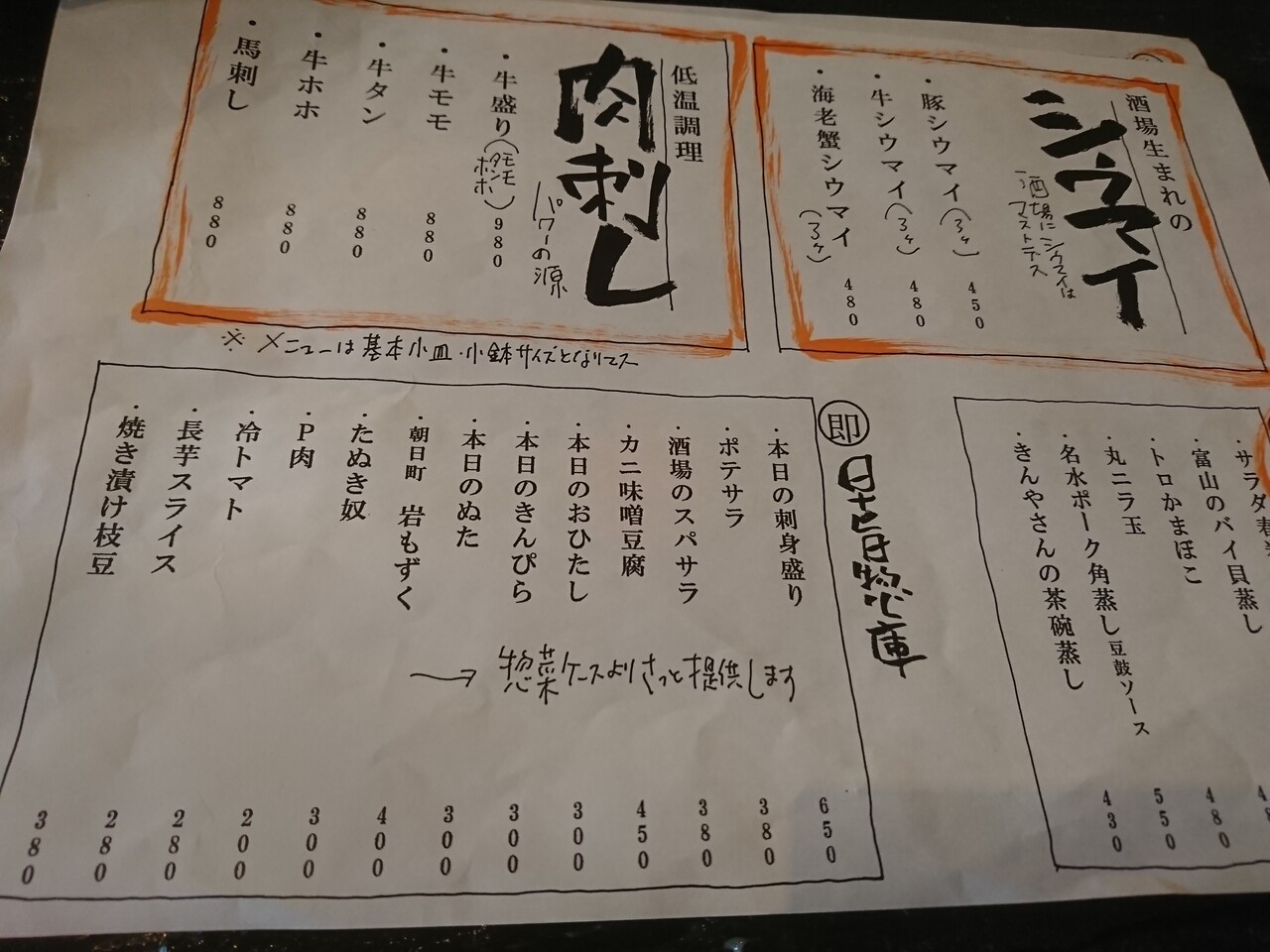 メニューはこんな感じ。肉刺しも気になるところだけど、『名水ポーク角蒸し』とか『たぬき奴』とか、下半分にも気になるメニューが目白押し。どれも日本酒に合いそうなところが素晴らしいと思うんだ。