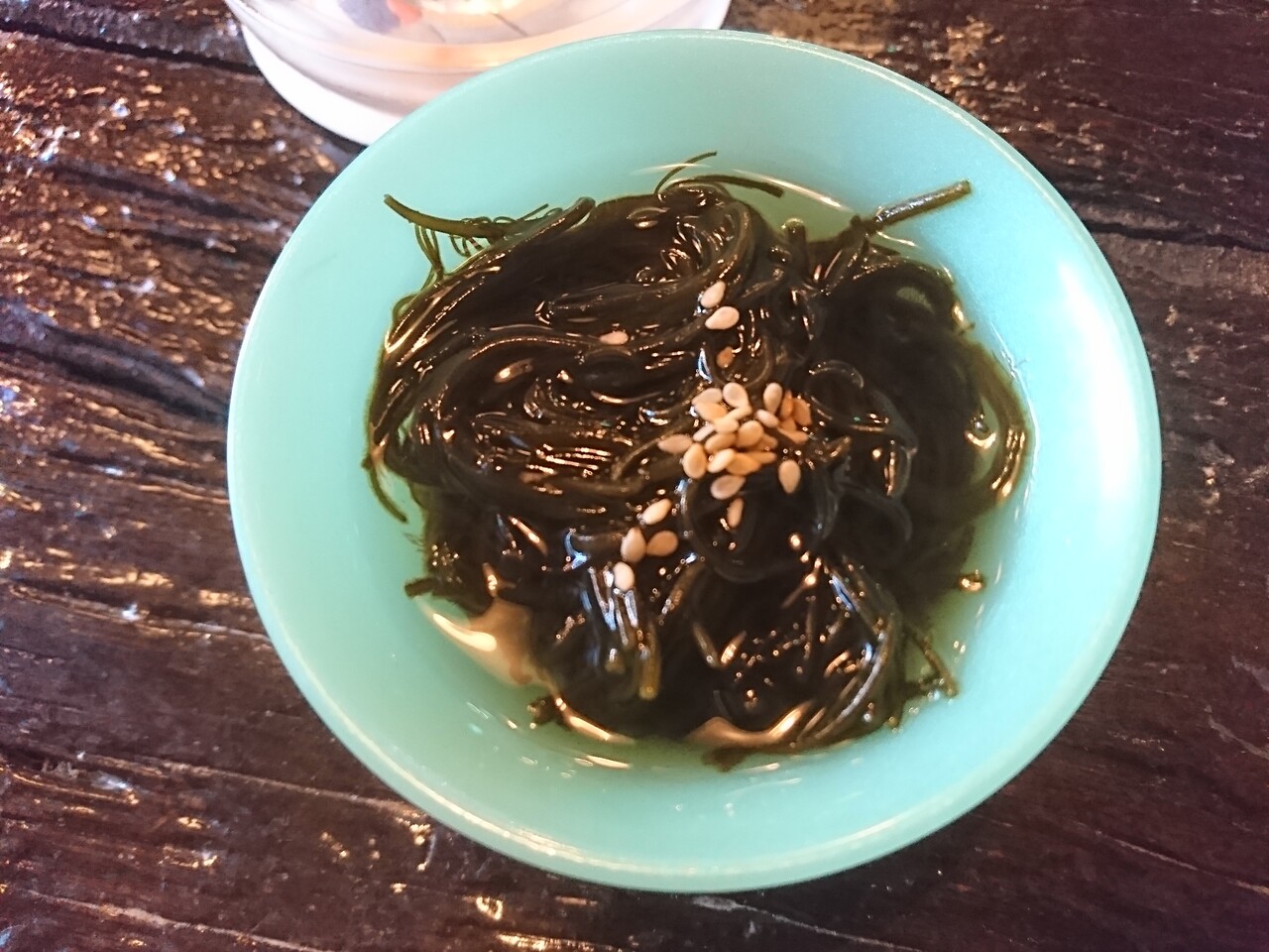かくして登場したのがこちら。ちょっとシャキシャキした歯ごたえがあって、ちょっと太めなところが、普段よく口にするもずくとは全く違っていたんだ。シウマイもよかったけど、この岩もずくに出会えたことが、ボク的には幸せだったよ。