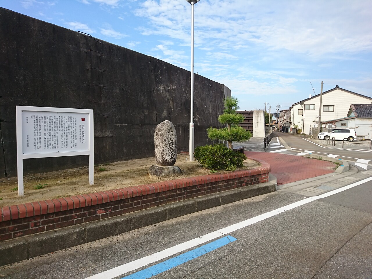 「なめりかわ宿場回廊」を西に向かって歩いていると、道はやがて海沿いに出るんだ。高さのある防波堤に守られているのは、冬になると海が荒れるからだろうか。