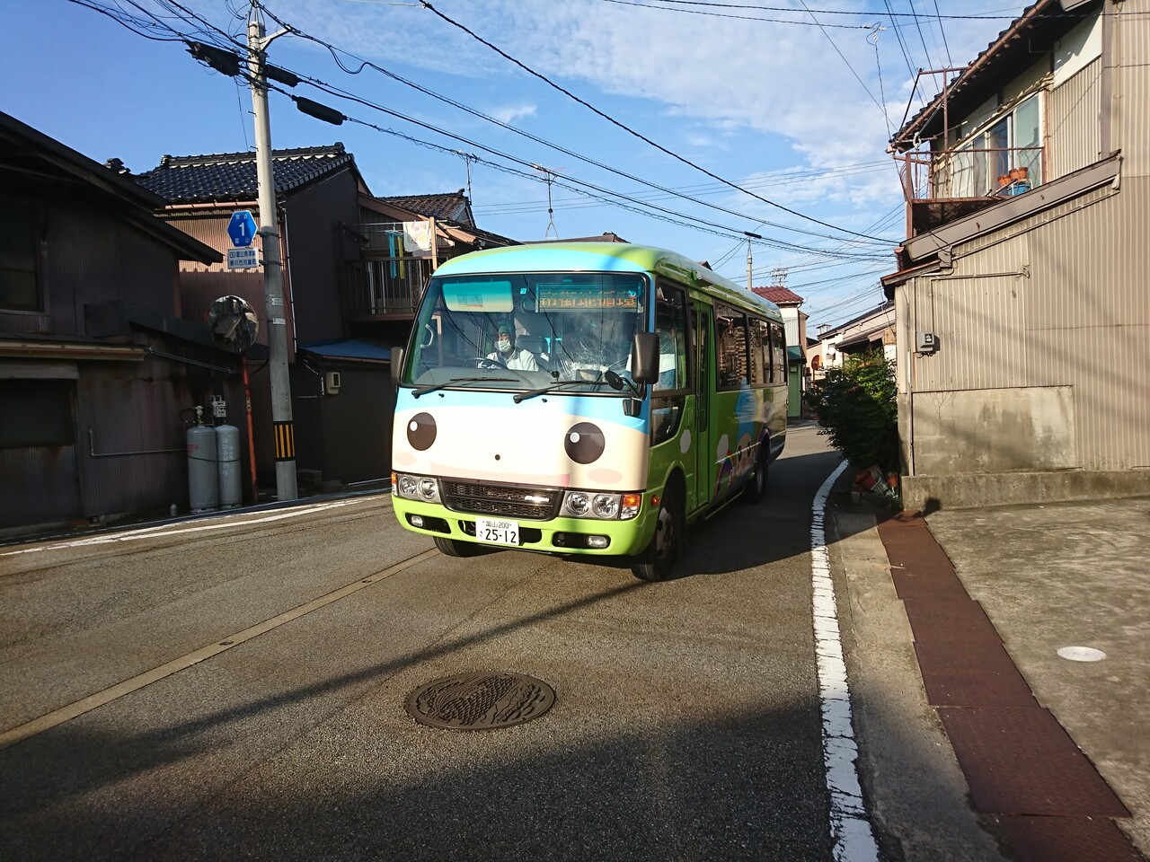 しばらく待っていたら、こんなかわいいバスがやって来たんだ。「のるmy car」っていうバスみたいだけど、ホタルイカの街滑川だけあって、イカにかけて「のるまイカ」と読ませたいらしい(笑)。