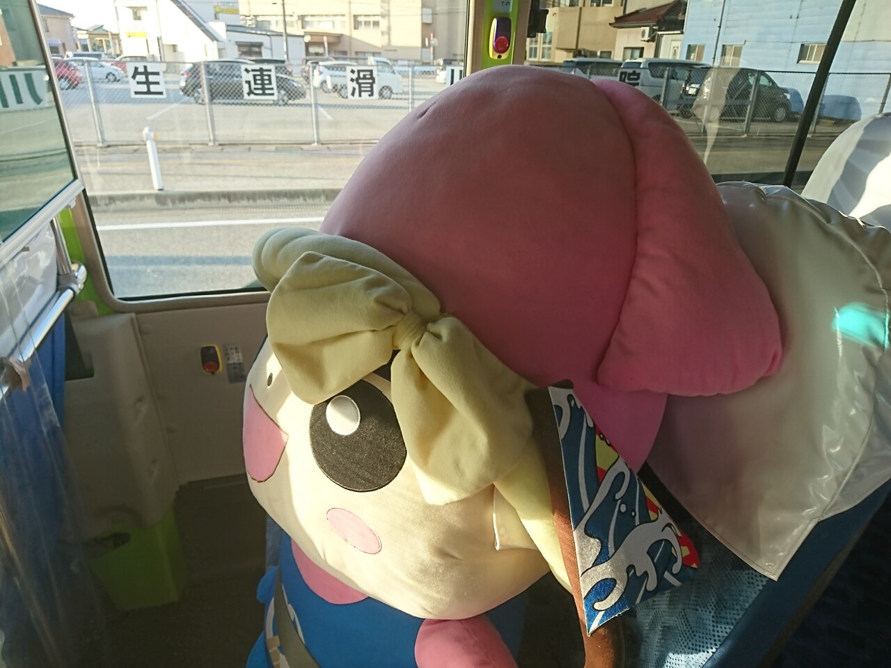 バスの中には、イカキャラの大きなぬいぐるみが座っていて、笑ってしまったな。乗った後は、けっこう広いエリアをぐるっと回って、そこそこ時間もかかったけど、100円でたっぷりバスの旅を楽しめたと思えば、お得だよね。